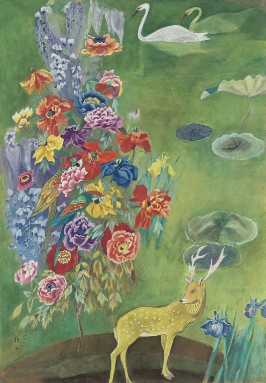 천경자의 1978년작 ‘윤삼월’은 꽃과 사슴, 백조, 새 등 작가 작품에 자주 등장하는 소재들이 환상적인 분위기의 화면에 함께 그려진 작품이다. 추정가는 8억5천만∼12억원이다.