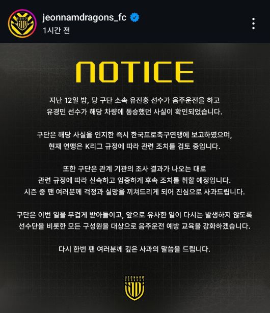 전남드래곤즈는 오늘(13일) SNS에 "지난 12일 밤 유진홍이 음주운전을 하고 유경민이 해당 차량에 동승했던 사실이 확인되었다"며 "관계 기관의 조사 결과가 나오는 대로 규정에 따라 신속하게 후속 조치를 취하겠다"고 적었습니다.