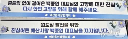 13일 뉴스1에 따르면 충남 예산군 예산읍 이장협의회는 최근 주요 도로변에 백 대표를 응원하는 메시지를 담은 현수막을 게시했다.