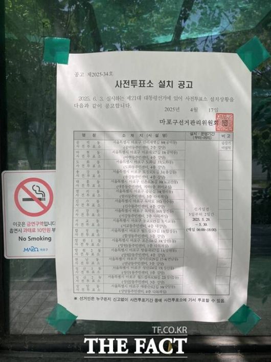 13일 <더팩트> 취재를 종합하면 지난 9일 서울 마포구 상암동의 한 거리에는 대선 사전투표소 설치 상황을 알리는 '사전투표소 설치 공고'가 붙어있었다. 공고에는 '선거인은 누구든지 신고없이 사전투표기간 중 사전투표소에서 투표할 수 있다'는 안내와 함께 사전투표소의 명칭과 소재지, 시설명 등이 적혀있다.