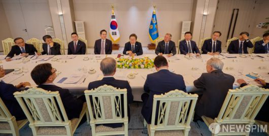 이날 간담회에는 재계 인사로 이재용 삼성전자 회장, 최태원 SK그룹 회장 겸 대한상의 회장, 정의선 현대차그룹 회장, 구광모 LG그룹 회장, 신동빈 롯데그룹 회장이 참석했다.