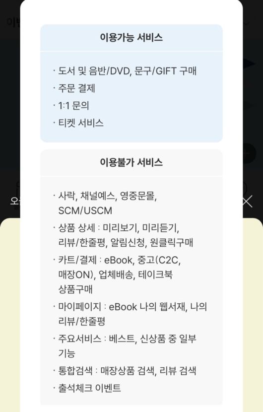 이에 따라 13일 오후 5시 기준 도서 및 음반·DVD, 문구, 티켓 서비스와 1:1문의 등이 활성화된 상태다. 다만 아직 사락, 채널예스, eBOOK, 중고책 서비스 등은 이용이 불가능하다.
