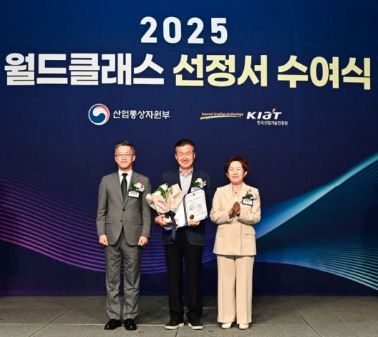 (사진 왼쪽부터)오승철 산업통상자원부 산업기반실장, 김정환 힘펠 대표, 민병주 한국산업기술진흥원장이 2025 월드클래스 선정서 수여식에서 기념사진을 촬영 중이다/사진제공=힘펠 |