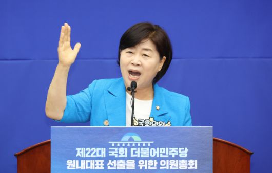 더불어민주당 원내대표 경선에 출마한 서영교 의원이 13일 국회에서 열린 원내대표 선출 의원총회에서 정견 발표를 하고 있다. /연합 |