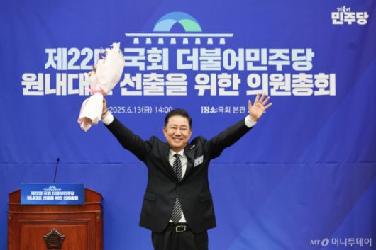 (서울=뉴스1) 이광호 기자 = 13일 오후 서울 여의도 국회에서 열린 더불어민주당 제2기 원내대표 선출 의원총회에서 새 원내대표로 당선된 김병기 의원이 두팔 들어 인사하고 있다. (공동취재) 2025.6.13/뉴스1 Copyright (C) 뉴스1. All rights reserved. 무단 전재 및 재배포, AI학습 이용 금지. |