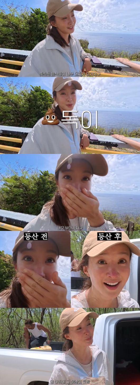 이시영은 "조식도 패스하고 등산 왔다. 도저히 조식을 먹을 수 없었다. 축적된 음식들로 너무 돼지가 되어서, 진짜 똥독이 오른 것 같다. 얼굴 상태 나 오늘 별로 찍고 싶지도 않다. 너무 부었다"라며 얼굴 상태를 확인했다.