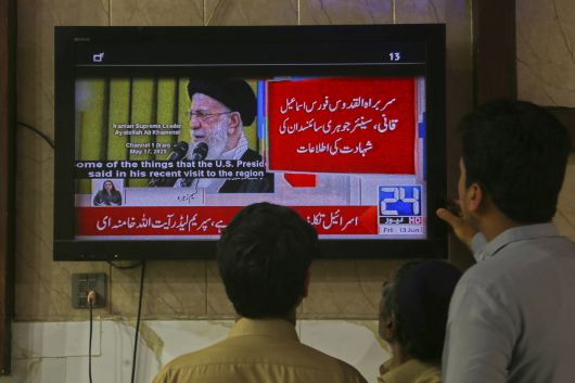 지난 13일(현지시간) 파키스탄 페샤와르에서 시민들이 이란에 대한 이스라엘의 공격 관련 뉴스 보도를 시청하고 있다. [AP] |