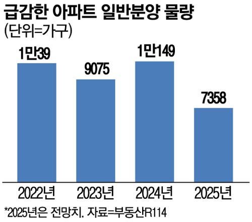 13일 부동산 시장조사 업체 부동산R114에 따르면 올해 이미 이뤄진 서울 아파트 일반분양과 연말까지 남아 있는 예정 물량을 합하면 총 7358가구인 것으로 집계됐다. 이는 지난해 1만149가구 대비 28%(2791가구) 줄어든 수치다. 특히 2021년 2960가구 이후 4년 만에 가장 적은 물량이다. 최근 10년 내 기록으로 봐도 2021년에 이어 두 번째다.