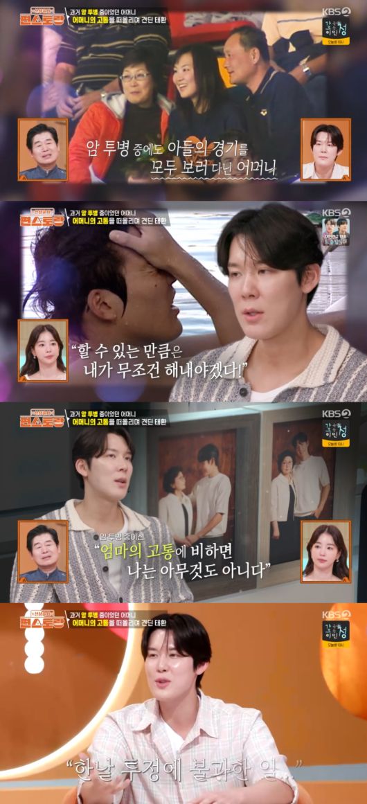 박태환은 어마어마한 기록으로 대한민국 수영 역사를 쓴 수영의 신화를 썼는데, 박태환은 "어머니가 저 어렸을때 암 투병하시고 힘드셨다. 수영이란 종목을 해서 끝을 봐서 '대한민국 1등' 이런 게 아니라 '우리 엄마를 위해서, 아빠를 위해서 할 수 있는 만큼은 내가 무조건 해야겠다 했다'"라고 말했다.