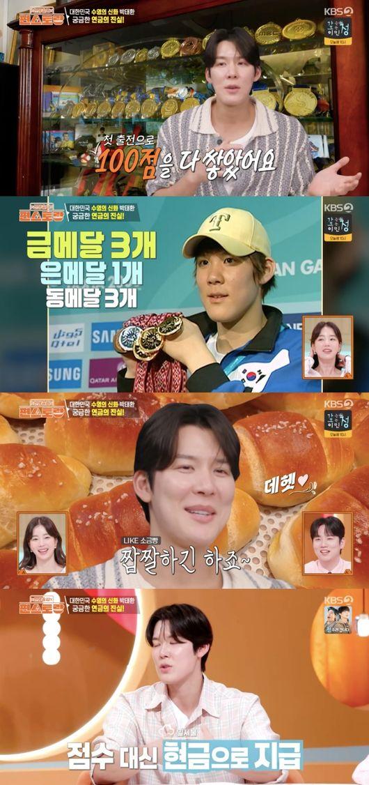 특히 박태환은 고등학교 때 첫 출전했던 2006년 도하 아시아게임에서 출전과 동시에 100점을 다 쌓았다고. 그는 “동메달3개, 은메달 1개, 금메달3개”라며 “그 금액이 이제 조금 소금빵처럼 짭잘하긴 하죠”라고 너스레를 떨었다.