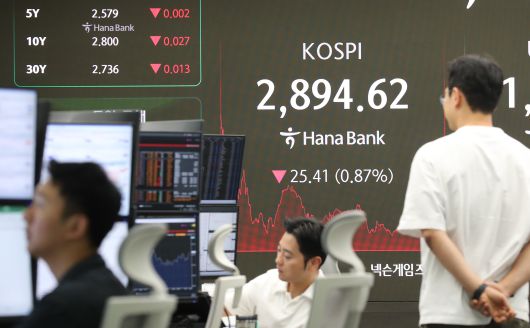 코스피는 장중 한때 1% 넘게 하락하며 2870대까지 밀렸지만, 외국인이 장 후반 순매수(매수가 매도보다 많음)로 전환하면서 낙폭을 일부 만회했다. 이날 외국인과 개인은 각각 1212억원, 4669억원 순매수했고, 기관은 6109억원 순매도했다. 코스닥 지수는 전날보다 2.61% 내린 768.86으로 마쳤다.