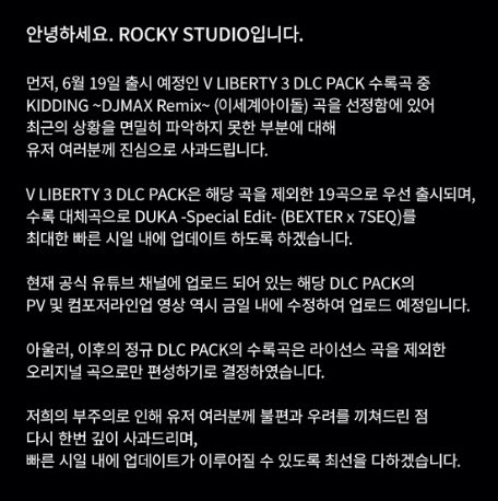 논란이 확산되자 개발사 로키스튜디오는 13일 공식 SNS로 "최근의 상황을 면밀히 파악하지 못한 채 곡을 선정한 점을 진심으로 사과드린다"며 "해당 곡을 제외한 19곡으로 DLC를 우선 출시하고 대체곡을 최대한 빠른 시일 내에 업데이트하겠다"고 밝혔다.