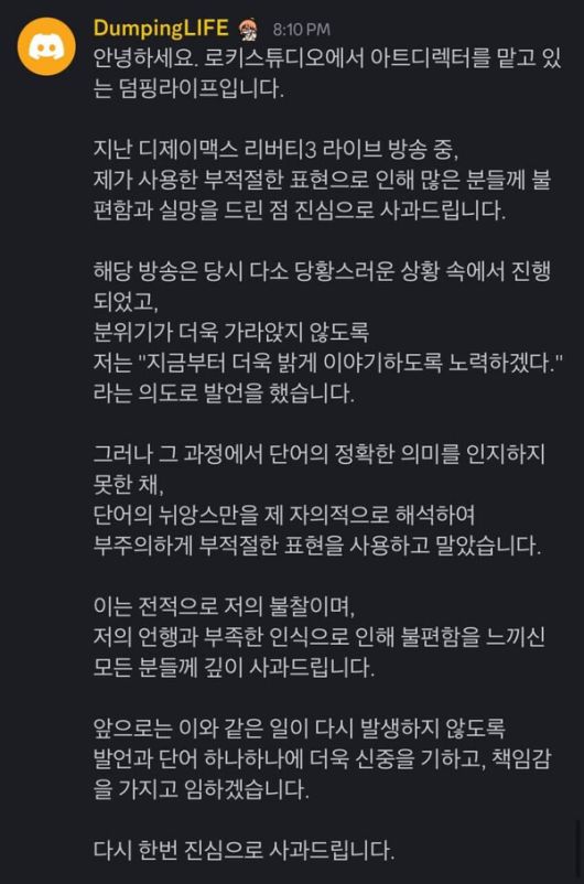 아울러 해당 콘텐츠의 아트 디렉터로 알려진 '덤핑라이프'는 디스코드로 남성 혐오 표현인 '드릉드릉' 발언 관련 별도의 사과문을 게재했다. 그는 "방송 중 당황스러운 상황에서 분위기를 밝히기 위해 사용한 표현이 부적절했다"며 "정확한 의미를 인지하지 못한 채 단어의 뉘앙스만을 자의적으로 해석해 표현한 점을 깊이 반성한다"고 밝혔다.