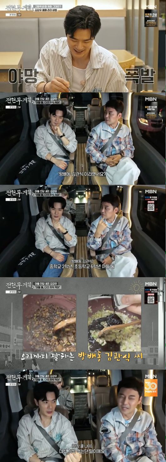 식비가 많이 들겠다는 전현무의 말에 김강우는 “엄청 많이 든다. 고기도 거의 근으로 시킨다”라고 혀를 내둘렀다. 아이들에게 밥도 직접 해준다는 그는 “중식도 많이 해주고. 연복 셰프님한테 같이 방송하면서 배운 게 있어서 짜장밥이나 마파두부나. 저희는 아들이 둘이라 방학 때는 다섯끼씩 먹는다. 그것만 해도 엄청 나다”라고 말했다.