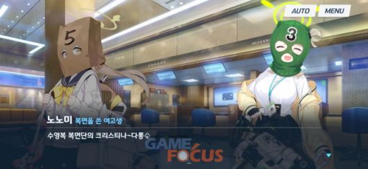 다음으로는 숱한 화제를 모으며 '블루 아카이브'를 대표하는 장면이자 '밈'으로 승화된 바로 그 챕터, '대책위원회 편 1장 ~출동! 수영복 복면단 2~ 챕터가 선택지로 선정됐다. 암흑 은행에서 대출 심사를 기다리던 '아루' 앞에 복면을 쓴 '대책위원회' 학생들이 등장하고, 이내 은행을 털어 현금을 훔쳐 달아나는 장면이다. 여고생들이 강도가 되어 은행을 턴다는 기상천외한 전개와 함께, '아루'가 '대책위원회'를 미처 알아보지 못해 악당으로 착각하고 동경하는 유머러스한 연출이 담겼다.