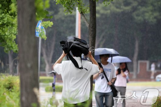 13일 오후 대구 달서구 계명대 성서캠퍼스 주변에 장맛비가 쏟아지는 가운데 우산을 준비하지 못한 학생이 가방으로 비를 피하며 발걸음을 재촉하고 있다. 2025.6.13/뉴스1 ⓒ News1 공정식 기자 |