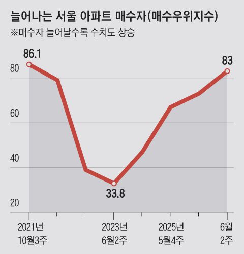 부동산 시장이 달아오르며 서울 아파트 매매 가격이 뛰고 있다. 지난 3월 토지거래허가구역이 확대 재지정되며 아파트 가격 상승세가 가라앉는 듯했지만, 이제는 강남 3구에 이어 마포·용산·성동·동작 등 서울 전역으로 번지고 있는 것이다. 13일 한국부동산원에 따르면 6월 둘째 주 기준으로 강북을 제외한 서울 24구의 각 아파트 매매 상승률이 3주 연속 오름세를 이어가고 있는 것으로 나타났다. 매수 수요를 가늠할 수 있는 서울 ‘매수우위지수’도 83으로 9주 연속 상승하면서, 2021년 10월 셋째 주(86.1) 이후 44개월 만에 가장 높은 수준을 기록했다. 이러한 상승세는 2020년 11월 ‘부동산 불장’으로 집값이 천정부지로 치솟을 때와 비슷한 수준이다. 양지영 신한투자증권 자산관리컨설팅부 수석은 “최근엔 하반기로 가면 금리 인하와 함께 공급 부족으로 인해 가격이 오를 수밖에 없다는 전망까지 팽배해지면서 집값이 들썩이고 있다”고 말했다.