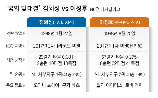 한국프로야구 넥센(현 키움) 입단 동기이자 절친한 친구 사이인 이정후(27·샌프란시스코)와 김혜성(26·LA 다저스)이 ‘꿈의 무대’ 미국프로야구 메이저리그(MLB)에서 첫 맞대결을 펼친다. 그것도 내셔널리그(NL) 서부지구 선두 자리가 걸린 중요한 3연전이다.