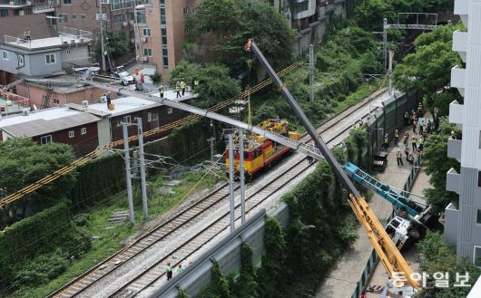 13일 오전 서울 서대문구의 한 아파트 앞 경의중앙선 가좌역∼신촌역 선로 위에 이삿짐 사다리차가 넘어져 있다. 이 사고로 일부 열차가 5시간 멈췄다. 변영욱 기자 cut@donga.com |
