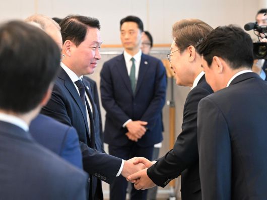 이재명 대통령이 13일 서울 용산 대통령실청사에서 열린 6경제단체와 기업인 간담회에서 최태원 SK 그룹 회장(대한상의회장)과 인사를 나누고 있다. 2025.06.13. 대통령실사진기자단 |
