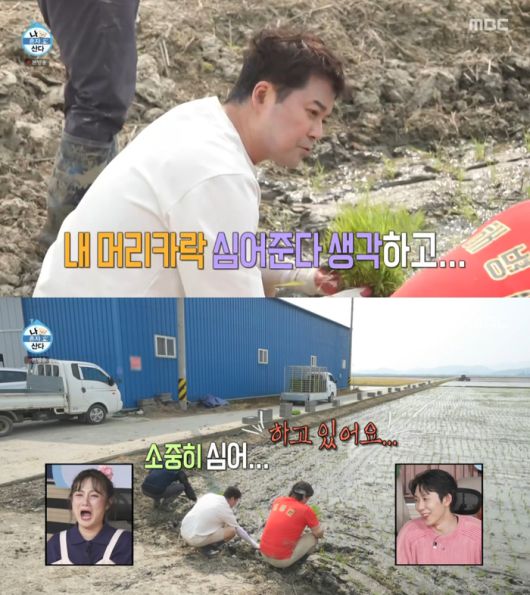 전현무와 구성환은 모판을 나른 후 이앙기가 닿지 않는 곳에 직접 모내기를 했다. 전현무는 모판에서 모를 하나 뽑고는 “모발 같아서 마음이 안 좋다. 촘촘해서 부럽다”고 씁쓸해했다. 이어 구성환에게 “빽빽할 때 지켜라. 내 머리카락 심어준다고 생각하고 소중히 심어라”라고 해 웃음을 자아냈다.
