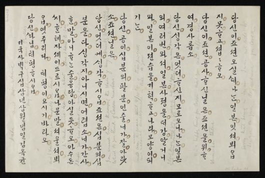 " 당신이 조선 오실 때 나는 일본에 있어 뵈옵지 못하고 섭섭하오. 당신이 조선 공사 하신 일은 조선을 위하여 경사롭소. 당신 생각은 어떠하신지 모르오나 나는 일본을 여러 번 와서 일본 사정을 대강 알거니와 일본이 전습을 개혁하고 나라 모양이 되기는 당신의 공이 십 분의 팔 분인 줄 내가 잘 알았소. 조선 일은 당신 어떻게 생각하십니까? 조선은 십 분의 십 분을 다 생각지 아니하시면 어렵소.내가 간사한 말 아니하는 줄 응당 아실 듯 하오. 아수돈 씨한테 자세히 들으십시오. 남은 말(은) 서울서 뵈옵고 여쭈리다. 태평히 오시기 바라오. 당신 따님 태평하십시오. (조선)개국사백구십삼년 삼월념일 김옥균 (현대어 번역: 오지연 케임브리지대 도서관 일본학·한국학 부서장 사서) "