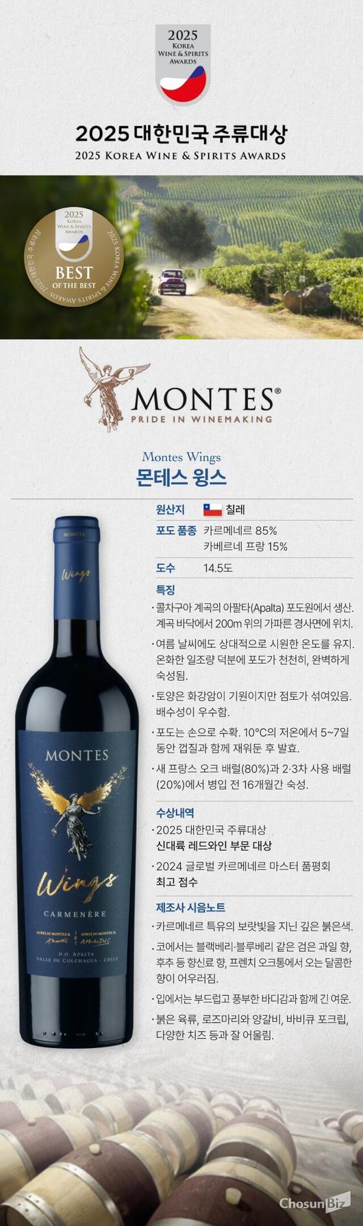 몬테스 윙스는 카르메네르 85%, 카베르네 프랑 15%로 블렌딩된다. 몬테스 알파 M이 카베르네 소비뇽, 몬테스 폴리는 시라의 정점을 표현했다면, 윙스는 카르메네르를 최고로 표현한 와인으로 평가받는다. 몬테스는 블렌딩을 통해 각 품종의 장점을 극대화하는데, 윙스 역시 카르메네르를 카베르네 프랑으로 보완해 구조감과 산도를 높이고 밸런스와 복합미를 극대화했다.