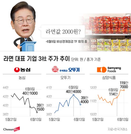 라면업계 관계자는 “대통령의 라면값 2000원 발언이 서민 대표 음식인 라면 가격을 내려야 한다는 의미로 받아들여졌다. 내수 비중이 큰 농심과 오뚜기 투자 심리에서 라면값 인하로 인한 실적 부진 우려가 선반영된 결과”라며 “이재명 정부의 물가 안정 기조에 국내 1·2위 라면 기업이 중심에설 수밖에 없기 때문”이라고 했습니다.