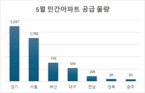 올 들어 민간 아파트 공급은 부진을 면치 못하고 있다. 1~2월은 3000여가구만 분양 시장에 나왔고, 통상 봄 성수기로 꼽히는 3월에도 5656가구에 그쳤다. 4월에는 경기 공급 물량이 7743가구로 크게 증가하며 올해 처음으로 전국에 1만가구 이상이 공급(1만3262가구)됐으나, 5월 들어 다시 쪼그라들었다.