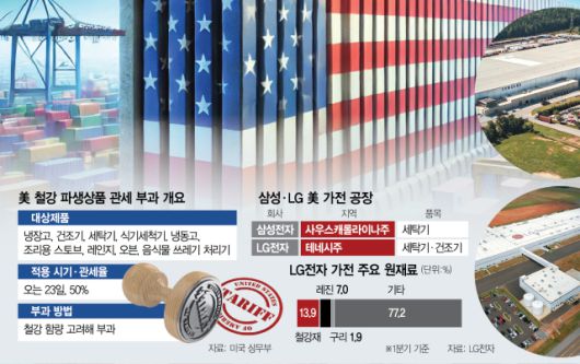 냉장고와 세탁기 등 가전제품에 들어가는 원재료 가운데 철강재 비중은 금액 기준으로 10%안팎이다. 원가에서 철강이 차지하는 부분만큼 50% 관세를 매기면 제품 값이 5%가량 비싸지는 셈이다. 하루 아침에 철강 관세 유탄을 맞은 가전 업계는 실제 영향을 면밀히 분석하는 한편 미국 생산 비중 확대 검토에 착수했다.
