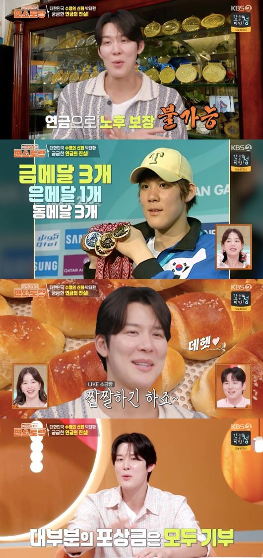 심지어 포상금도 메달 딸 때마다 받는다고. 이에 대해 박태환은 “근데 사실 저는 이제 포상금은 모두 기부했다”라고 밝혔다.