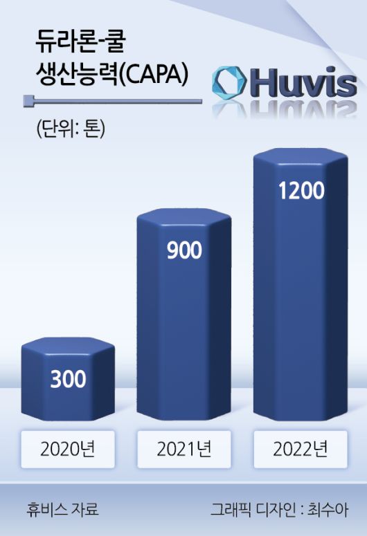 냉감 섬유는 말 그대로 ‘시원한 질감’을 구현한 섬유다. 열전도율이 높은 고밀도폴리에틸렌(HDPE)으로 만들어 피부의 열을 빠르게 흡수한다. 휴비스의 듀라론쿨은 국내 냉감 시장에서 시장점유율 70%를 차지하고 있다. 지난 2020년 연간 생산량 300톤(t) 규모로 상업생산을 시작한 이후 판매량이 빠르게 늘면서 2021년 900t, 2022년 1200t으로 생산량을 늘렸다.