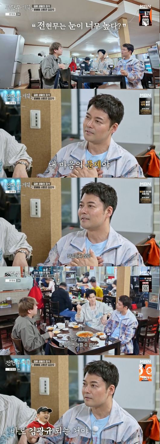 "뭐 없으면 어쩔 수 없다 이런 거다"라는 전현무의 한탄에 김강우는 "체념 하지 마라"라고 위로했다. 이에 전현무는 "체념까지는 안했다. 내가 여기서 체념하면 김광규가 되는 것"이라고 답해 폭소케 했다. /mk3244@osen.co.kr
