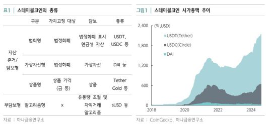 14일 하나금융연구소가 최근 발행한 ‘스테이블코인이 금융시장에 미치는 영향’ 보고서에 따르면 스테이블코인은 전통금융시장과 연결된 새로운 유동성 공급자로 주목받고 있다. 스테이블코인은 달러, 금 등 특정 자산 가치에 일대일로 연동돼 안정적인 가치가 유지되는 가상자산이다. 법정화폐처럼 결제 수단, 자산 저장 수단, 회계 단위 등의 기능을 수행하지만 공식적인 통화 공급 주체에 의해 통제되지 않는다.