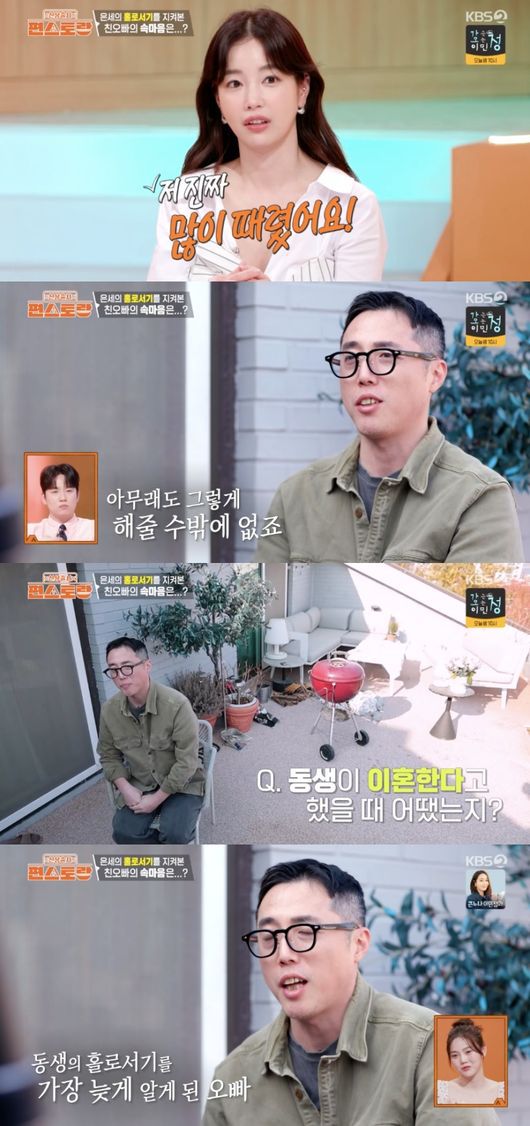 특히 기은세 이혼을 언급한 오빠는 “저도 많이 늦게 알았다. 중간에 과정을 전혀 몰랐고 다 끝나고 나서 알게 됐다. 그냥 잘했다고 했다. 어려운 결정을 한 것 자체가 저는 잘한 거라고 생각한다. 혼자서 못 살 아이라고생각하지 않는다. 잘 살 거라고 생각한다”라고 고백했다.