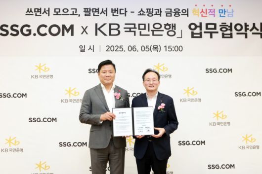 서울 영등포구 소재 SSG닷컴 사옥에서 열린 SSG닷컴-KB국민은행 업무 협약식에서 최훈학 SSG닷컴 대표이사(좌측)와 이환주 KB국민은행장(우측)이 기념촬영을 하고 있다./사진=KB국민은행 |