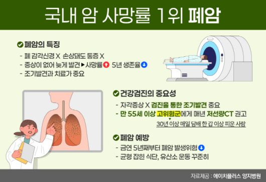 [이데일리 이순용 기자] 폐암은 국내 암 사망률 1위를 차지하는 위험한 질병으로 초기 증상이 거의 없어 조기 진단이 어려워 병을 키우게 된다. 기침, 호흡곤란, 흉통, 객혈 등의 증상이 간혹 나타나지만 가볍게 여겨 지나치는 사례가 많다 보니 조기 발견율은 20%에 불과하다. 특히 80% 이상은 3, 4기에 발견되는 경우가 많아 경각심이 필요하다.