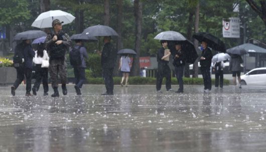 14일 오전, 남부지방과 제주도에 많은 비가 내린 가운데 시민들이 우산을 쓰고 길을 걷고 있다. |