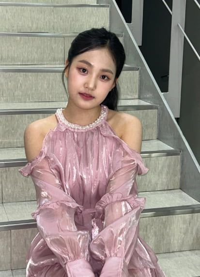 공개된 사진 속 김태연은 핑크빛 광택이 도는 오프숄더 드레스를 입고 계단에 앉아 다양한 포즈를 취하고 있다.