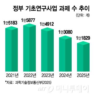 정부가 5월 발표한 고도화 방안에 따르면 정부 R&D(연구·개발) 사업 중 기초연구사업 과제 수는 2022년 이후 꾸준히 줄었다. 2021년, 2022년 당시 1만 5000개 이상이던 기초연구 과제 수는 2023년 들어 1만4000개, 2024년 1만3000개 수준으로 줄었다. 올해는 지난해 대비 2000개 줄어든 1만1829개 수준이다.