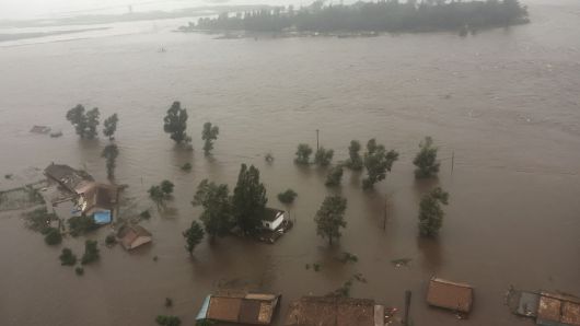 ▲ 지난해 폭우로 침수된 북한 신의주, 의주군 수해 현장의 모습.