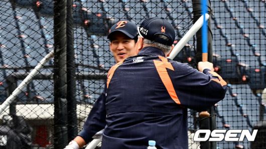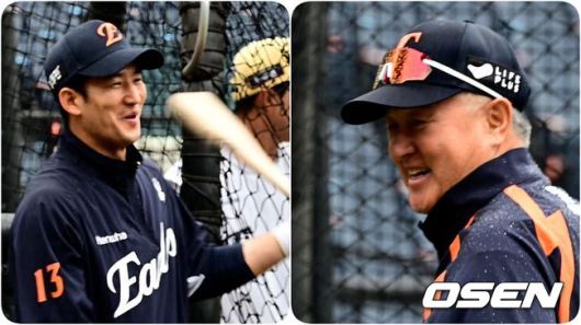 그러던 중, 김경문 감독의 눈을 사로잡은 장면이 있었다. 바로 안방마님 최재훈의 타격 자세였다. 호기심 가득한 눈으로 최재훈의 자세를 따라 하며 웃음을 터뜨리는 김 감독.