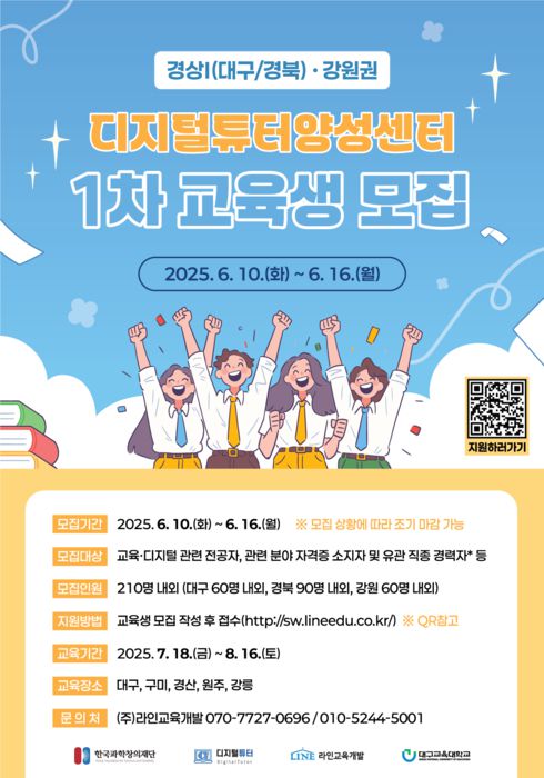 교육 대상자는 총 210명으로, 지역별로는 대구 60명, 경북 90명, 강원 60명으로 구성된다. 교육은 오는 7월 18일부터 8월 16일까지 70시간동안 대구, 구미, 경산, 원주, 강릉 등에서 온·오프라인 병행 방식으로 진행된다.