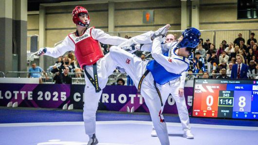 ▲ 정우혁(왼쪽)이 14일(한국시간) 미국 노스캐롤라이나주 샬럿 컨벤션센터에서 열린 샬럿 2025 세계태권도 그랑프리 챌린지 남자 68㎏급 결승에서 대만의 쉬하오여우를 상대로 발차기 공격을 하고 있다.