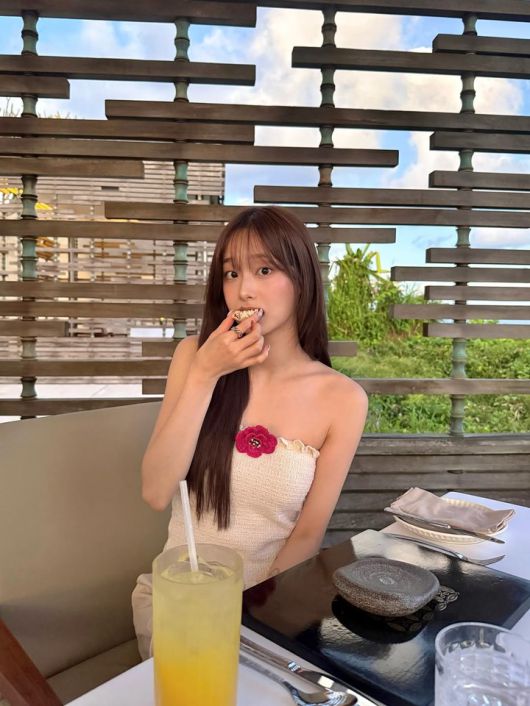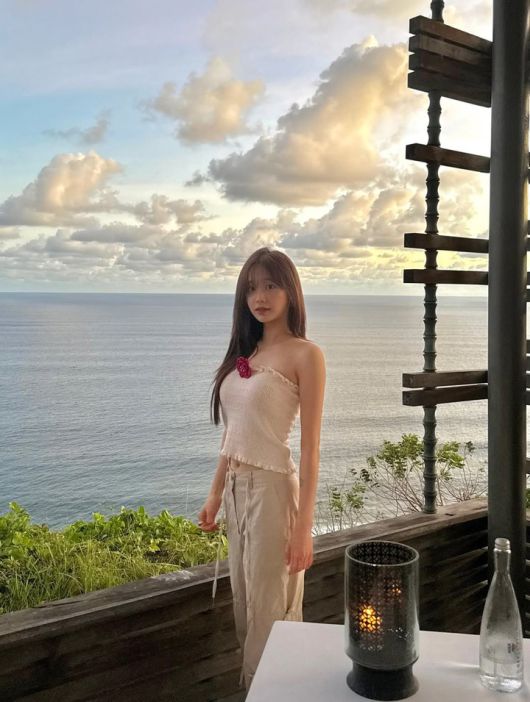 공개된 사진 속에는 푸른 바다와 석양이 어우러진 배경 아래, 여유로운 미소를 머금은 츄의 모습이 담겨 있다. 크림 톤의 튜브탑 상의와 라이트 베이지 컬러 팬츠를 매치한 츄는 따뜻한 햇살을 닮은 스타일링으로 시선을 사로잡았다.