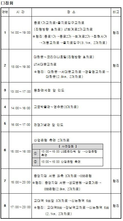오후 2시부터 7시까지 종로1가교차로에서 을지로입구교차로 구간(3.1km)과 대한문~코리아나호텔 방면(2.9km), 중앙지검 서문에서 OSB은행까지(2.9km), 교대역 인근 강남역 방향 도로(2.1km) 등에서는 행진도 함께 진행된다.