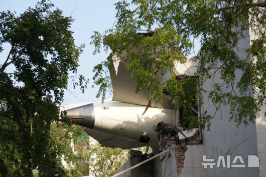 [아마다바드=AP/뉴시스] 12일(현지 시간) 인도 구자라트주 아마다바드에서 발생한 여객기 추락 사고 현장에 기체 꼬리 부분이 건물에 박혀 있다. 이날 아마다바드 공항에서 이륙한 영국행 에어인디아 AI171편 여객기가 추락해 탑승자 242명 가운데 1명을 제외한 전원이 숨졌으며, 추락 현장의 학생 등 약 50명도 사망한 것으로 전해졌다. 2025.06.13. |