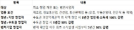 정리해 보자면 △최초로 창업한 개인·법인사업자인 경우 △부동산임대, 유흥업, 전문직 등은 제외한 제조업, 정보통신업, 통신판매업, 건설업 등에 한해 △청년이 수도권 과밀억제권역 외의 지역에서 창업하면 5년간 법인세·소득세를 100% 감면 해준다. △청년은 수도권 과밀억제권역 내 창업인 경우에도 5년간 50%까지 감면해 준다.