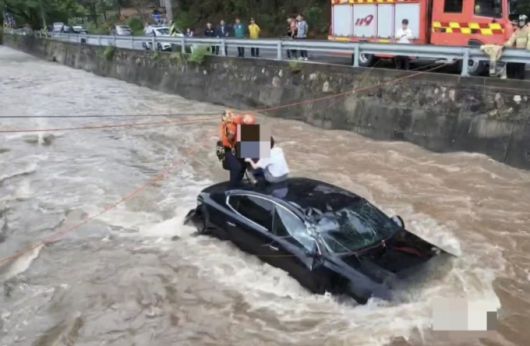 추락한 차량엔 30대 여성과 9세 딸이 탑승해 있었다. 이들이 탄 차는 불어난 물에 휩쓸려 가다가 하천 중간에 고립된 상황이었다.