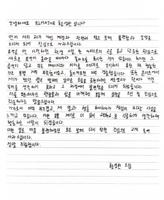 13일 황성빈은 82메이저 공식 SNS 계정을 통해 "안녕하세요. 82MAJOR 황성빈입니다"라며 장문의 자필 사과문을 게재했다.
